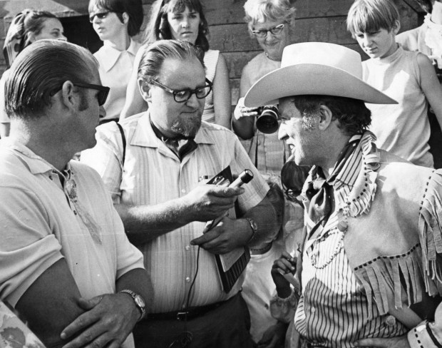 Prime Minister Pierre Trudeau being interviewed by Kamloops radio reporter Bob Egby in the late 1960s.