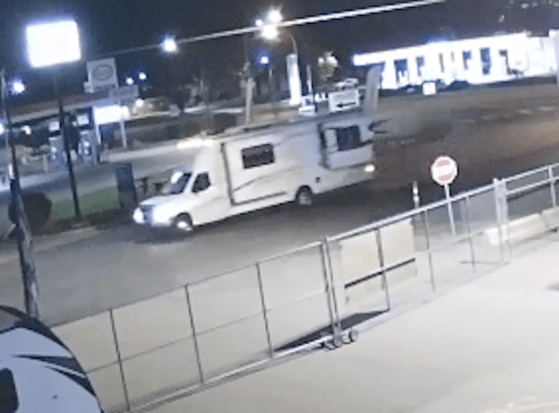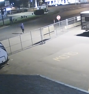 Surveillance video shows a male walking towards the motorhome and shortly after, the vehicle drives away. The male is wearing a blue hoodie, black pants and white runners.
