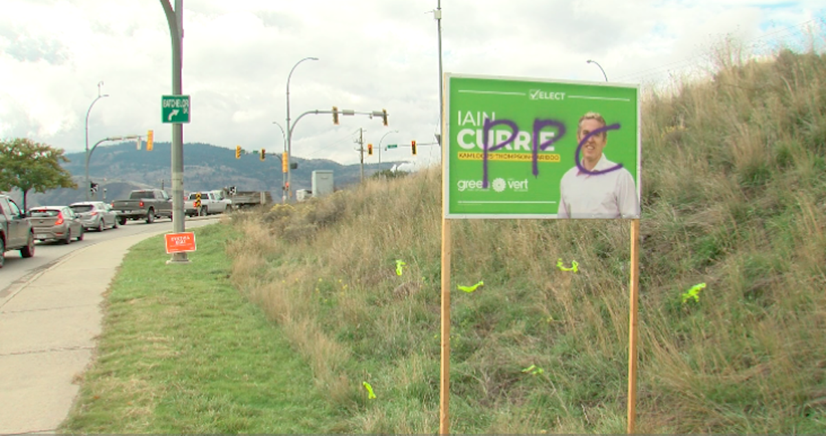 Ken Finlayson, the People’s Party of Canada candidate in Kamloops-Thompson-Cariboo, disavows the vandalism, saying it definitely is not something he or his party is responsible for. In fact, his sign crew has been helping clean up the signs of his opponents.