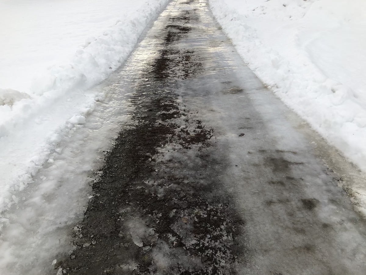 In town, where crews keep everything under control, streets remain, for the most part, clear and dry but in rural areas it’s a nightmare. Roads, driveways and yards are frozen rinks of treacherous ice.