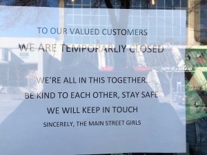 But not this week, not on this day. At least half the parking stalls are empty. About every second or third store is locked up. Each has a notice taped to the front door explaining that, due to the COVID-19 virus, it will remain closed until further notice.