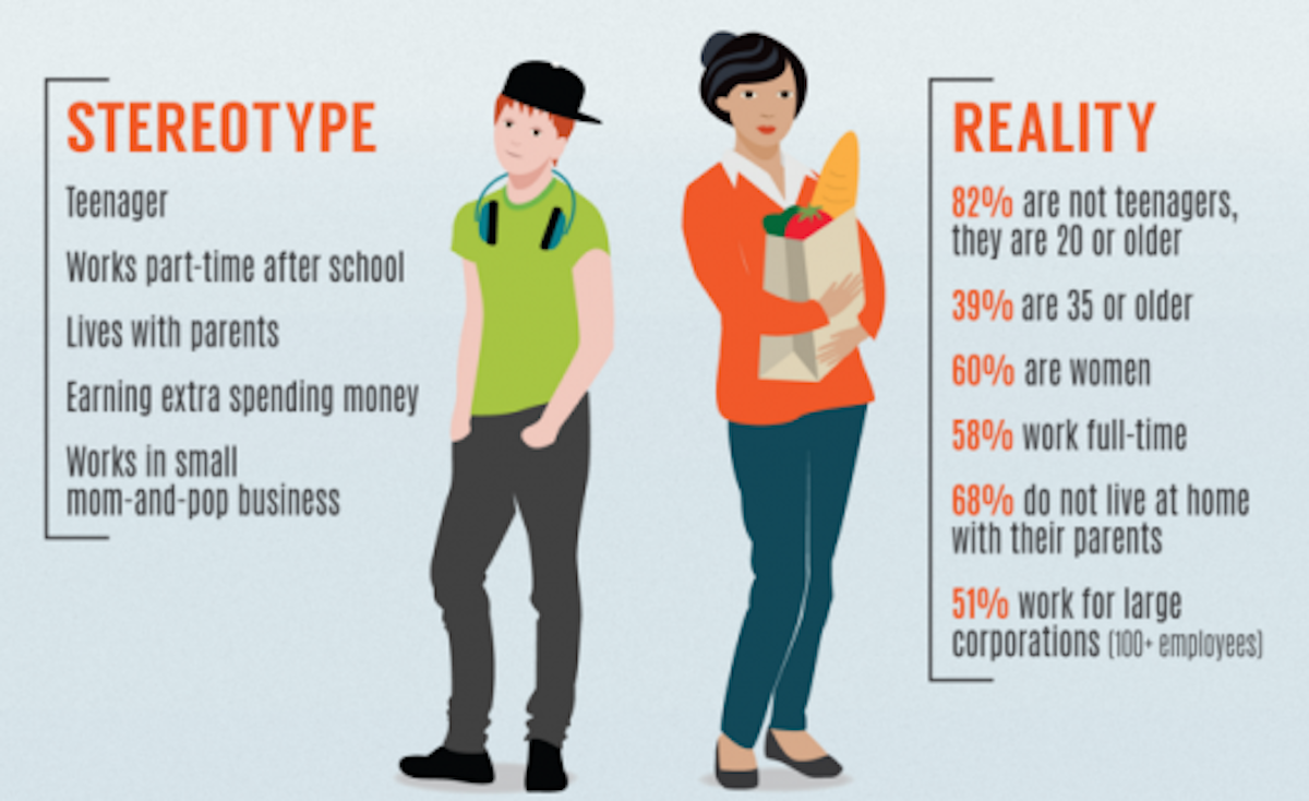 1. Given the graphic on ‘stereotype’ and ‘reality’, I would agree with your summation of not postponing the minimum wage increase. Those numbers clearly show its not just about supporting after school kids at McDonalds type workers, but the majority is about adults supporting themselves and families on low wages in many employment sectors, at a moment when these workers desperately need the cash.