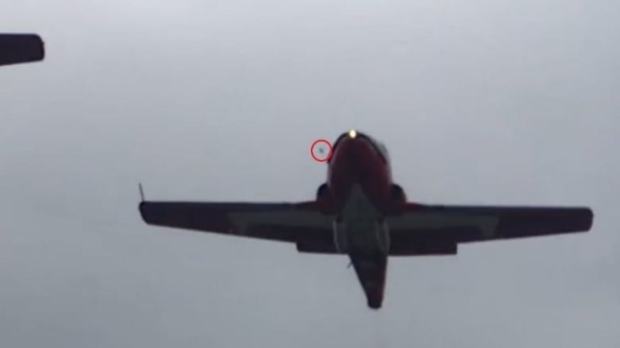 Red circle show what is believed to be a bird near engine intake of Snowbirds’ Tutor jet. (Image: RCAF)