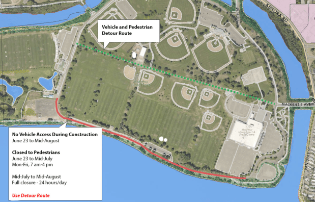 The multi-use pathway will be closed to pedestrians Monday to Friday between 7 a.m. and 4 p.m. starting June 23 through to mid-July. Pedestrians are asked to use the detour route during these times. From mid-July to mid-August, the pathway will be fully closed at all times.