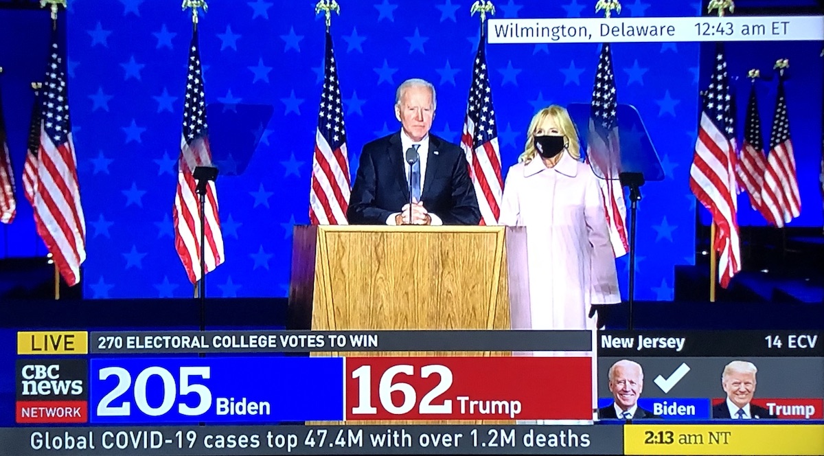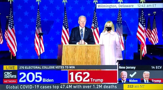 National Public Radio (NPR) has declared Biden leading 238 to Trump 213, with 87 undecided electoral seats. CNN has Biden at 224 to Trump’s 213, with 101 undecided.