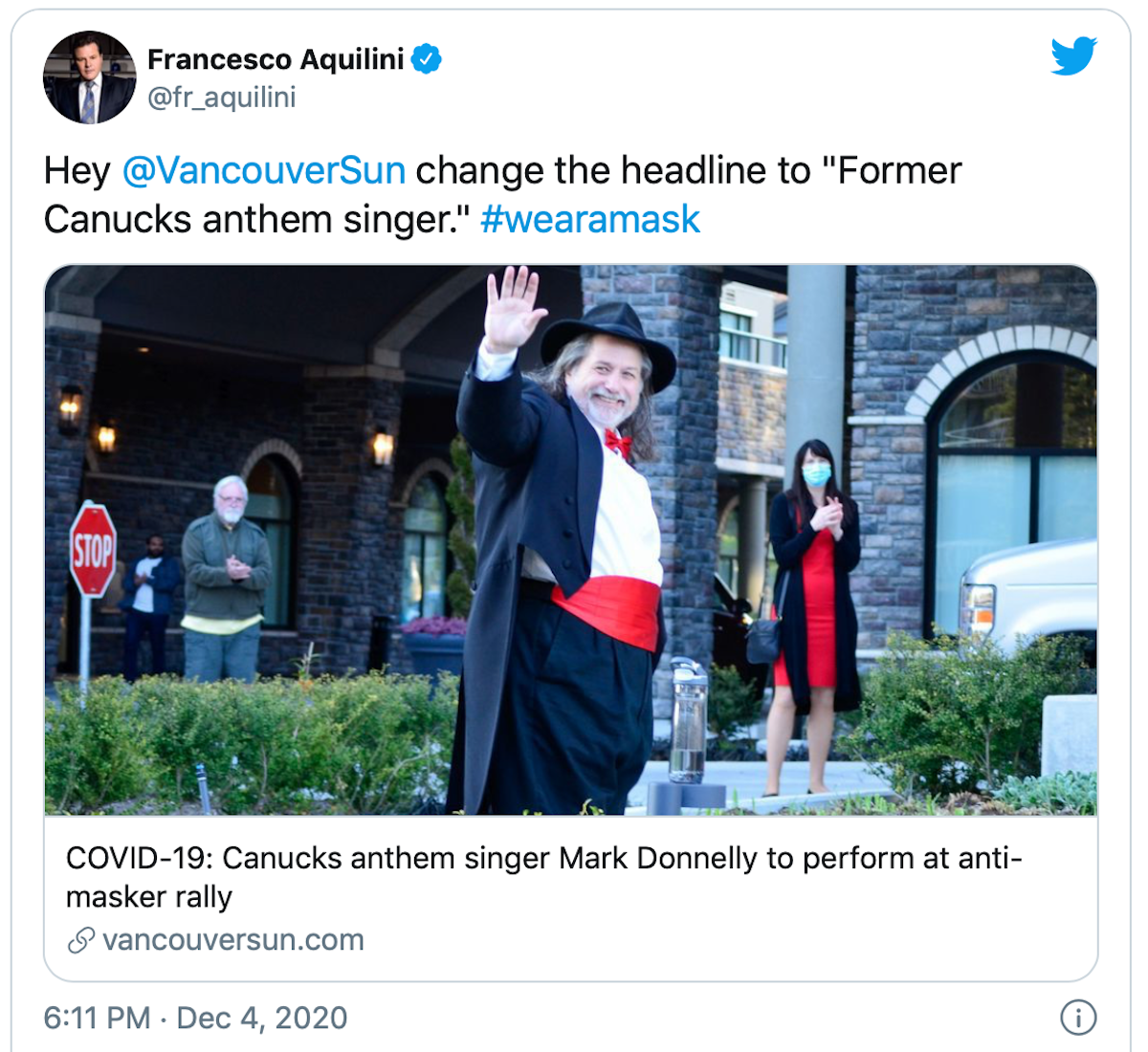 His name is Mark Donnelly and, up until last weekend, he was employed by the hockey team to sing the national anthem at Canucks games. He used his national anthem skills at what was called a Christmas Freedom Rally in Vancouver, basically a protest against COVID-19 restrictions.