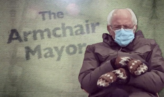 He wears a practical beige parka and knitted mittens. No fancy overcoat and leather gloves for Bernie.