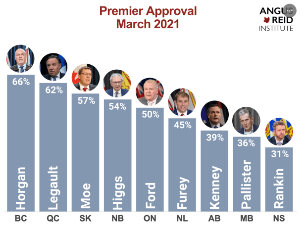 This leaves Manitoba’s Brian Pallister and Alberta’s Jason Kenney as not only the least-approved of, but the most disapproved of by those in their provinces. Pallister appears to be bouncing back a little, at 36 per cent compared to 32 per cent last quarter. Kenney’s approval remains statistically unchanged, currently at 39 per cent.