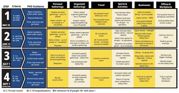 YESTERDAY, THE B.C. GOVERNMENT released its four-step plan for getting back to normal. A grid of 24 blue and yellow squares outlining the steps we need to go through on our path back to normal. It’s as if getting out of COVID-19 is an elaborate game of Snakes and Ladders.