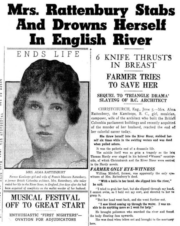 In March 1935, as Francis sat dozing with a drink in the Rattenbury home, Villa Madeira, someone clobbered him in the back of the head with a wooden mallet. Alma at first indicated she was responsible, but blame soon shifted to the family’s teenage chauffeur and household helper, George Stoner, with whom she had been having an affair. He was arrested after telling a housekeeper he had done the deed.
