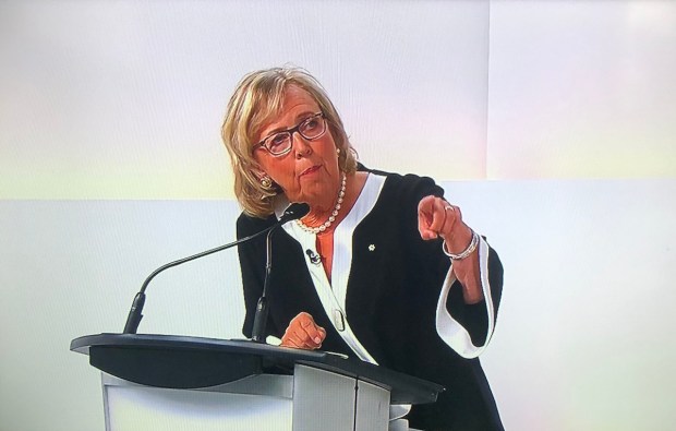 Except for the Green Party’s Elizabeth May. Instead, she said how sad she was to miss church on Maundy Thursday. For the Mary Winspear Centre audience, it was a flip-the-switch moment, reassuring them about who she was as a person.