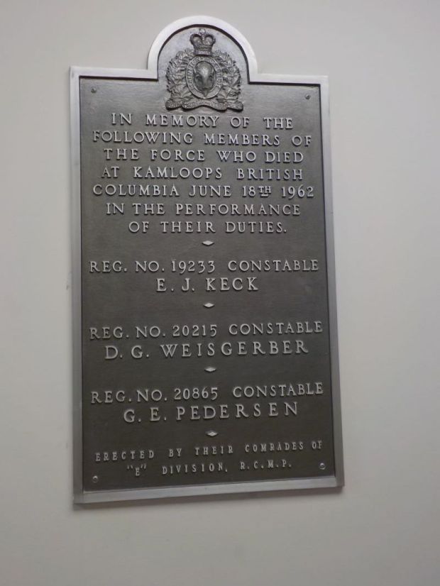 The brass plaque was in memory of three Kamloops RCMP constables who were killed near the location on June 18, 1962: Elwood Joseph Keck, Gordon Eric Pedersen, and Donald George Weisgerber. The officers were shot and killed while responding to a call involving a man with a gun.