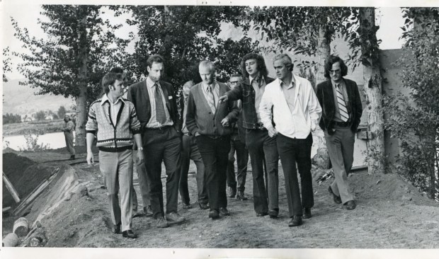 MP David Anderson (second from left) tours Oak Hills flood in 1972. At left is Bill Mercer. Merv Chertko is second from right, and the Armchair Mayor is on the right.