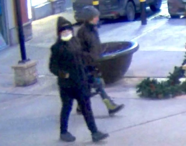 Photo description: In the back, a suspect is wearing large beige snow boots, a dark jacket, and a grey toque. In the front, wearing a white mask, toque, and dark jacket with the hood up, is her suspected accomplice.