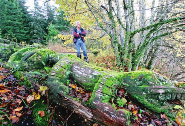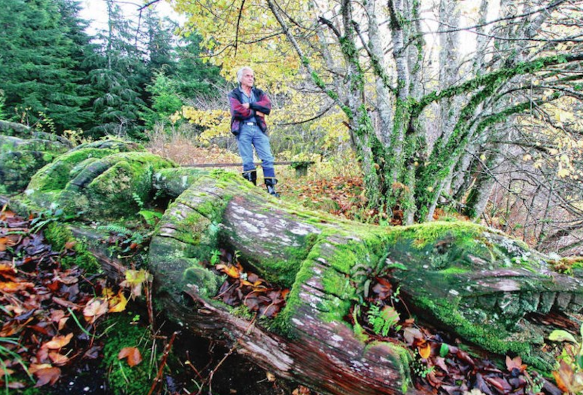 Bill Cranmer and fallen totem near where his father held a potlatch 100 years ago. (Image: Victoria Times Colonist)
