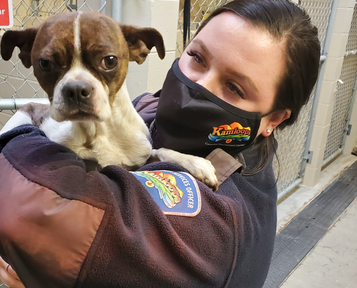 A City news release said today (Jan. 25, 2022) a community services officer (bylaws) responded and found a small dog hiding under a boat. After retrieving the scared dog, the officer returned to the Community Services office to decide on next steps.