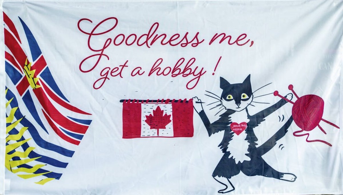 What they came up with was a design that incorporates the Canadian and B.C. flags and the quote John Horgan directed at convoy protesters: “Goodness me, get a hobby.” The banner depicts the store’s artist’s cat, Lulu, doing just that, taking up knitting as a hobby and fashioning a Canadian flag. (Lulu, by the way, has her own Instagram account: @lulubattlecat.)