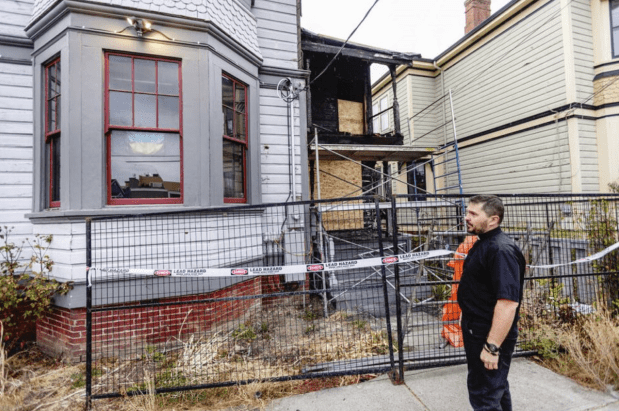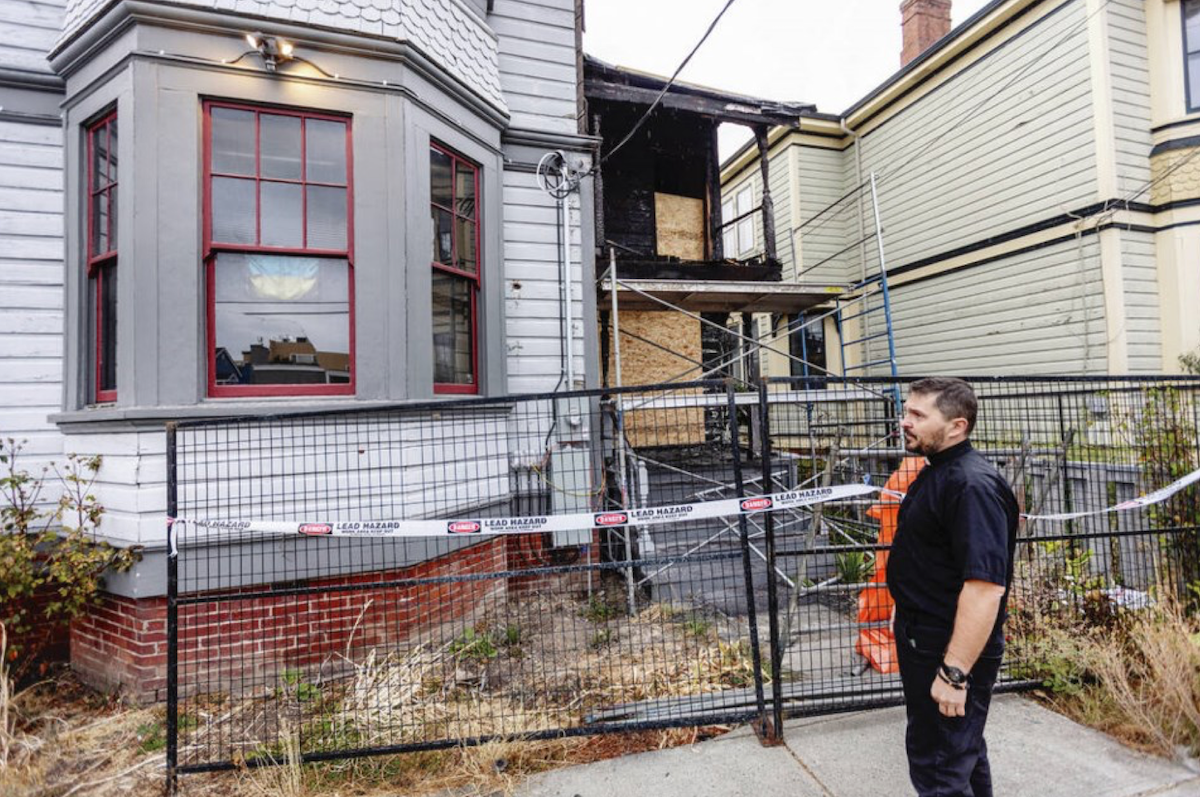 Father Yuriy Vyshnevskyy in front of the fire-damaged house next to the Ukrainian Catholic Church of St. Nicholas. (Image: Darren Stone, Victoria Times-Colonist)