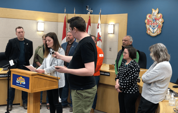 The statement, read by Coun. Katie Neustaeter with the other seven gathered behind, took only a few minutes, after which they filed out of chambers without taking questions.
