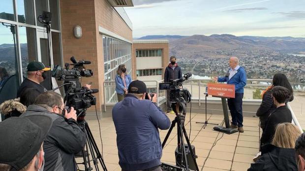 Then-Premier John Horgan promises Kamloops a cancer care centre, October 2020 (Image: CFJC Today / James Peters)
