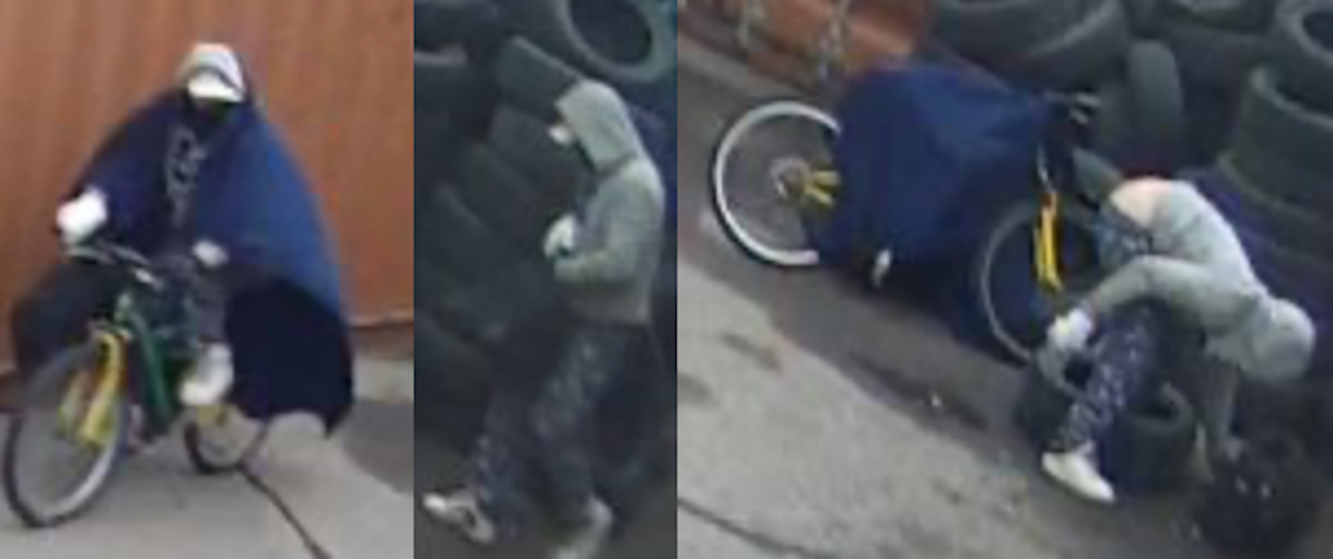 “Security footage obtained as part of the investigation shows a suspect on a green and yellow mountain bike with a blue blanket draped over it, wearing a grey hoodie, bluish pants, and a cast or bandage wrapped around their right forearm,” said Cpl. Crystal Evelyn.
