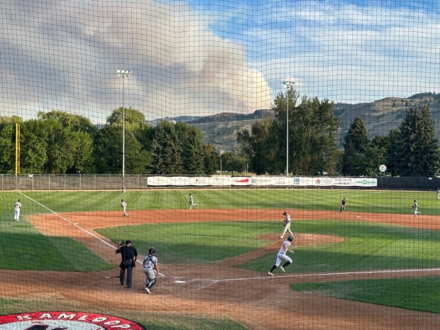 Baseball fans had a clear view of wildfire smoke during Friday evening NorthPaws game at Norbrock Stadium. (Image: Mel Rothenburger)