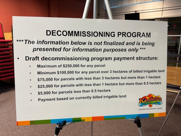 Information placard from earlier meeting on Noble Creek irrigation system decommissioning. (Image: Mel Rothenburger)