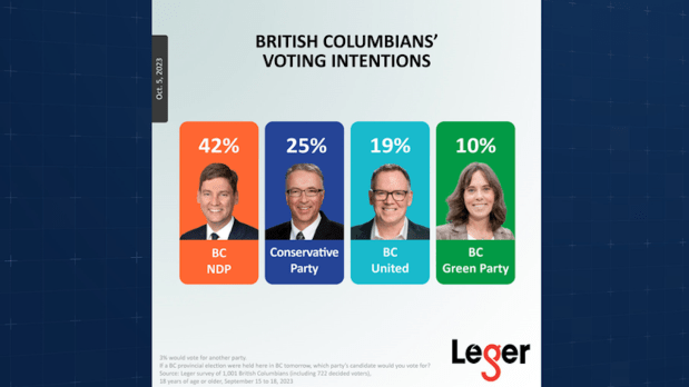 Kevin Falcon’s B.C. United party is down to 19 per cent, with the Green Party maintaining its familiar 10 per cent support level.