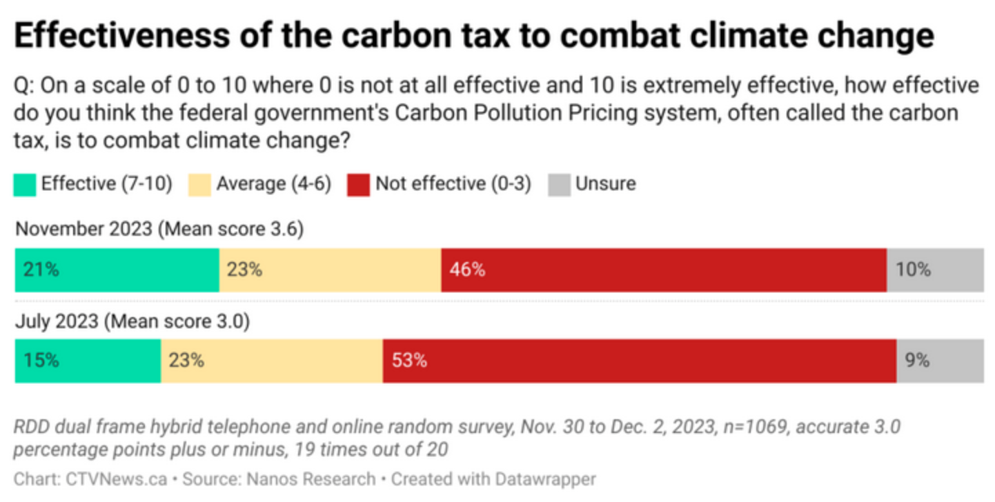 A news story by CTV earlier this morning (Monday, Dec. 11k 2023) had a headline reading, “Nearly half of Canadians think carbon tax is ineffective at fighting climate change”
