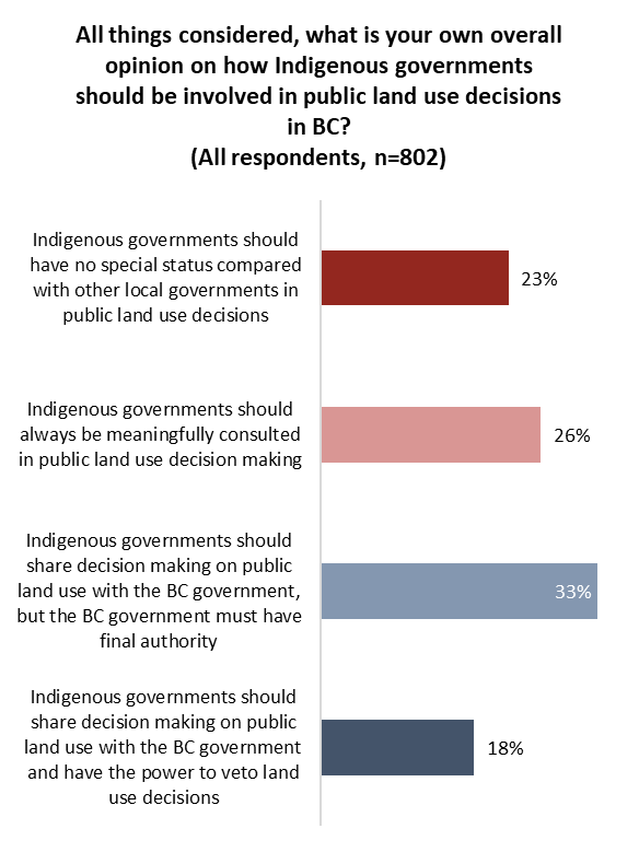 Another one-quarter (26%) say only “meaningful consultation” is needed, and one-in-three (33%) say that the B.C. government should share decision-making but maintain final authority.