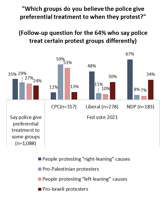 Past Conservative voters feel that left-leaning causes in general, and specifically pro-Palestinian protests, are given unfair leeway, while past Liberal and NDP voters are more likely to say the opposite, that right-leaning protest groups and to a lesser extent pro-Israeli demonstrators, are given preferential treatment by police.