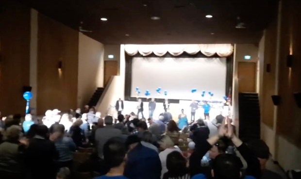 Crowd applauds BC Conservative Leader John Rustad at rally Monday night (Image: Facebook)