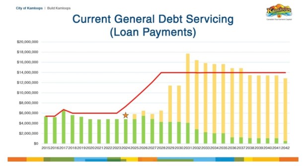 We currently budget for (collect taxes for) up to $6 million a year, which is approximately 4.6% of our total revenue. As we add the 1% each year, that budget will gradually increase to $14 million by 2029, in time to take out the first significant loan for Build Kamloops. We need permission now to take on the borrowing (in order to advance the projects, seek grants and donations, etc.) but we don’t actually need to borrow any significant amount until the facilities actually open. So we are able to build our borrowing capacity as we build these facilities and then take out our loan without any large single year tax increase.