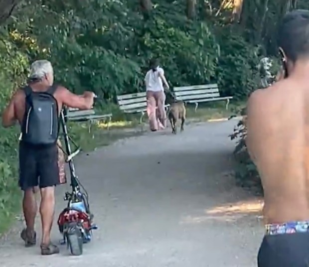 Owner is followed as she flees with her dog after it fatally attacked a small on-leash dog. (Image: Facebook)
