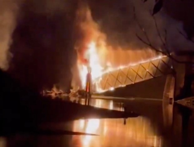 The Red Bridge is lost to us. We’re not supposed to jump to conclusions because, of course, an investigation will be done, but am I going out on a limb in suspecting the fire that destroyed it early today (Sept 19, 2024) wasn’t caused by accident or spontaneous combustion?