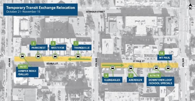 The Lansdowne Transit Exchange will be relocated to St. Paul Street between the 400 and 600 blocks during stage five. Traffic will be permitted through the corridor, but on-street parking will not be available in bus zones.