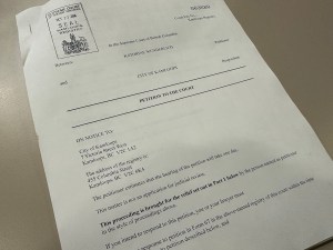 Resident Kathrine Wunderlich, with a new group called Kamloops Citizens United, served the City with legal documents during today’s (Oct. 22, 2024) regular meeting of council. Filed with the court earlier in the day, the petition  alleges the City “failed to follow a lawful and transparent process aligned with the spirit and intent of the legislation,” disregarded “a significant and vulnerable elector population” and derided opponents of the projects.