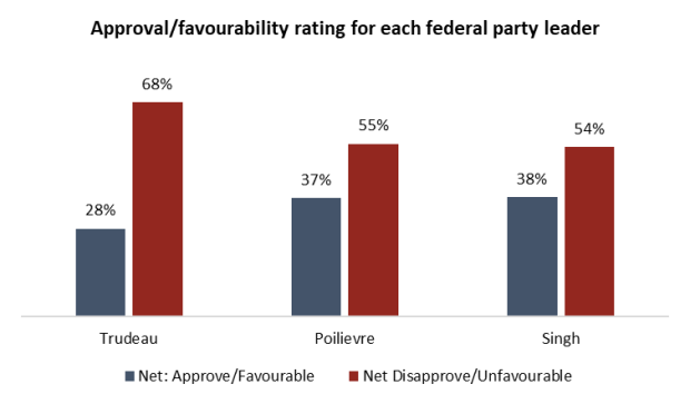 His fellow major federal party leaders are faring better, but not by much. Both CPC leader Pierre Poilievre and NDP leader Jagmeet Singh are viewed unfavourably by more than half of Canadians and have the favourable opinion of fewer than two-in-five: