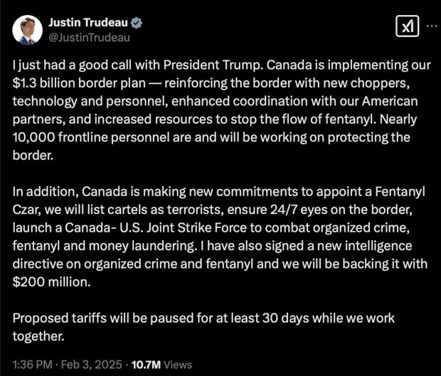 So, if you want us to appoint a “fentanyl czar,” and strike a new Canada-U.S. joint strike force to combat fentanyl and organized crime, put more helicopters in the air and increase coordination with you, no problem. We were working on it anyway, but if you want to claim we’re doing it because you threatened us, go ahead.