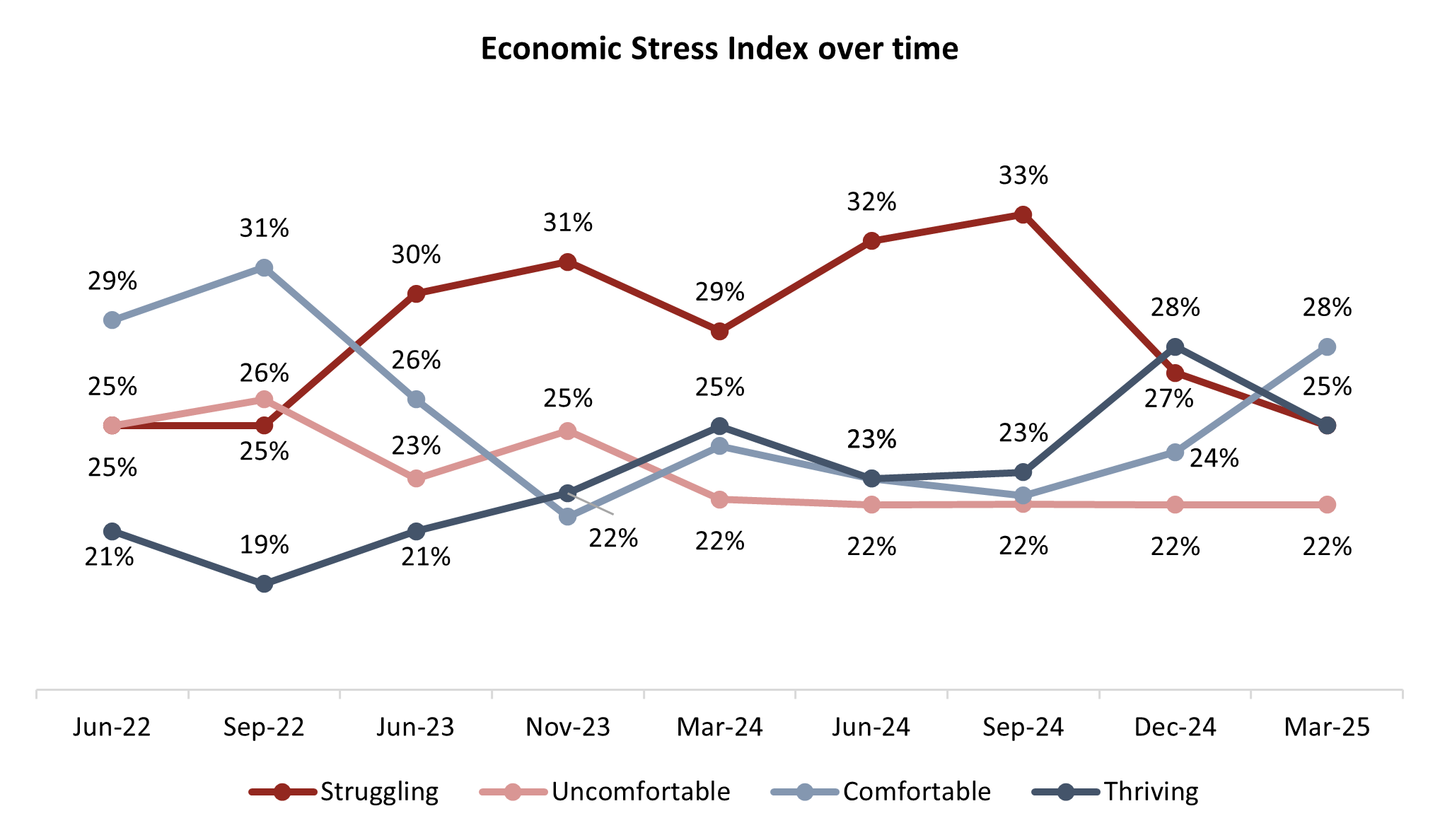 New data from the non-profit Angus Reid Institute finds a two-point decrease this quarter in the number of Canadians “Struggling” on the Economic Stress Index, which measures self-professed ability to pay for housing, groceries, and debt, as well as optimism about the coming year and an assessment of past 12 months.
