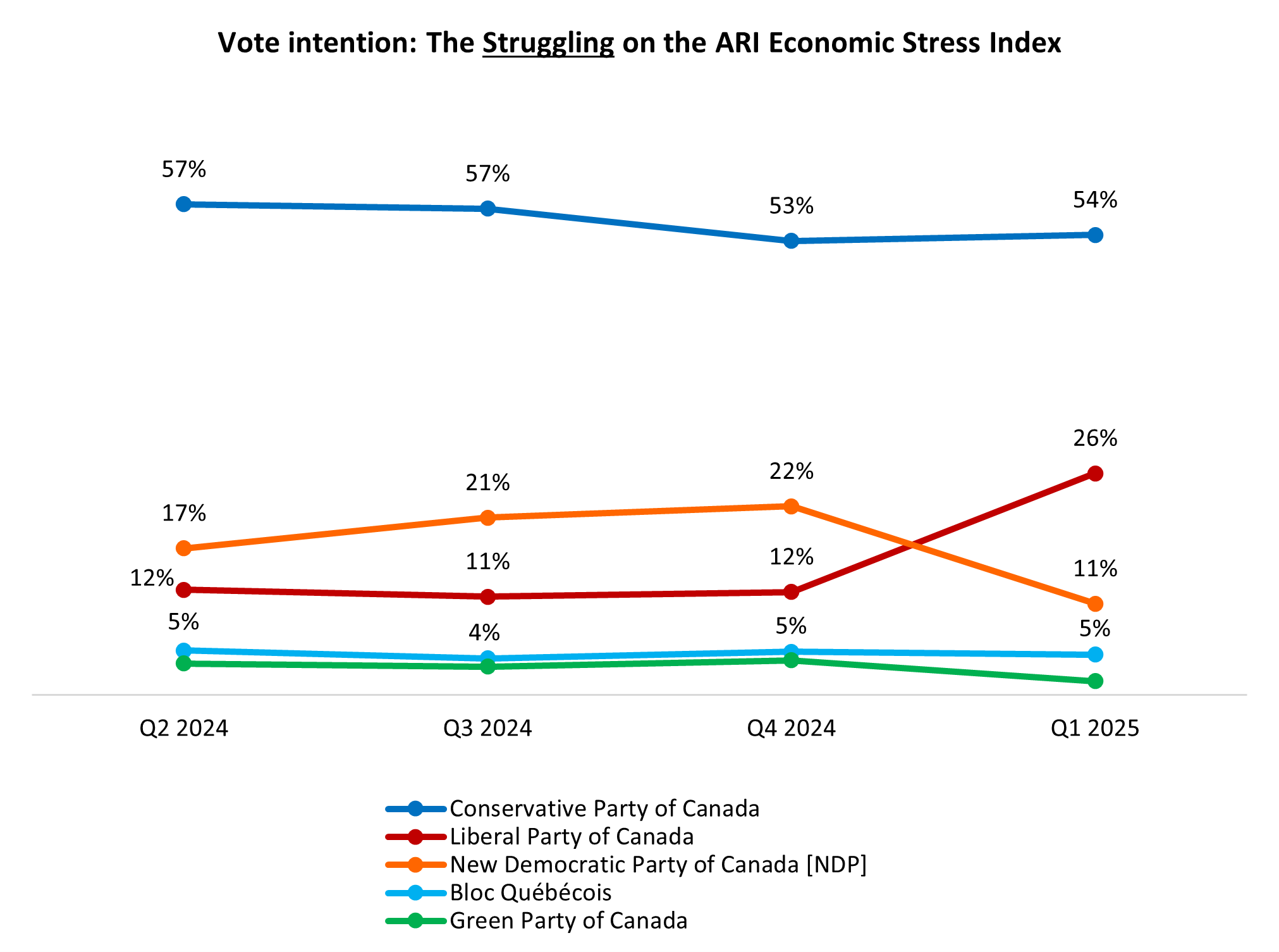 Among the Uncomfortable, the Liberals and Conservatives are now tied after the CPC led by 29 points in December. The Liberals lead by 15 points among the Comfortable and 30 within the Thriving. The Conservatives led both groups at the end of 2024.