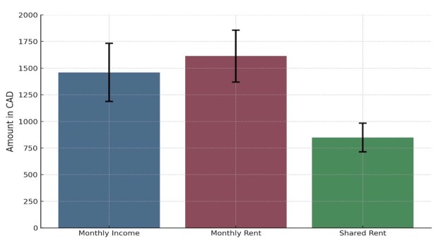 Figure 1: Average monthly income, rent and shared rent from survey of 300 international students.