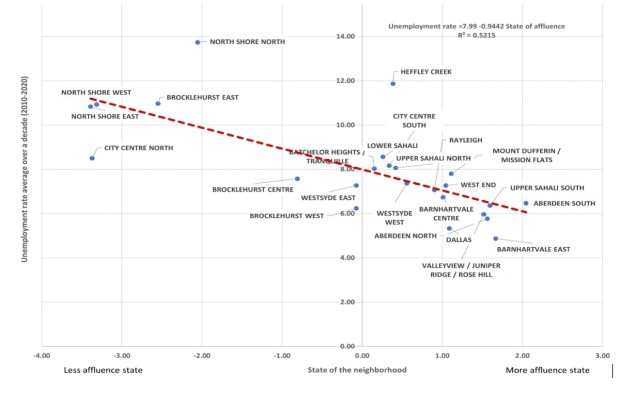 Figure 2: Convergence versus divergence of unemployment rates in the neighbourhoods of Kamloops. CC BY-NC-SA 4.0
