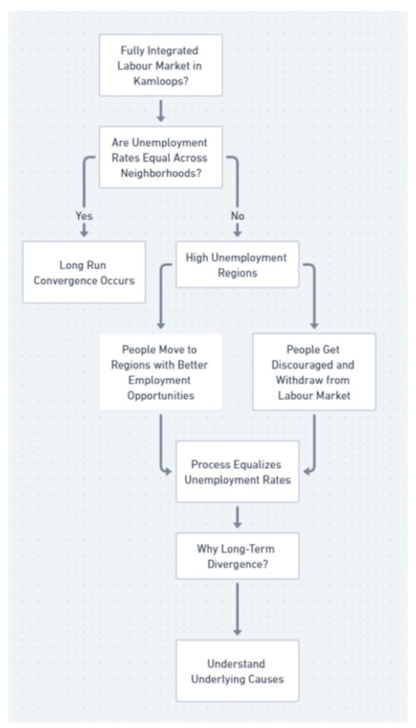 Kamloops, by contrast, faces none of these frictions. It is an integrated labour market where all 24 neighbourhoods share the same currency, language, and institutional systems. On paper, it should function seamlessly. And yet, unemployment rates are not converging here too, they are diverging and staying apart for at least a decade or longer. Why? Because even within integrated markets, other barriers persist such as lack of access to transportation, educational inequalities, and the lingering effects of income segregation within the city. These findings highlight the importance of addressing local constraints to mobility and employment, even in a city that, on paper, should be economically integrated.