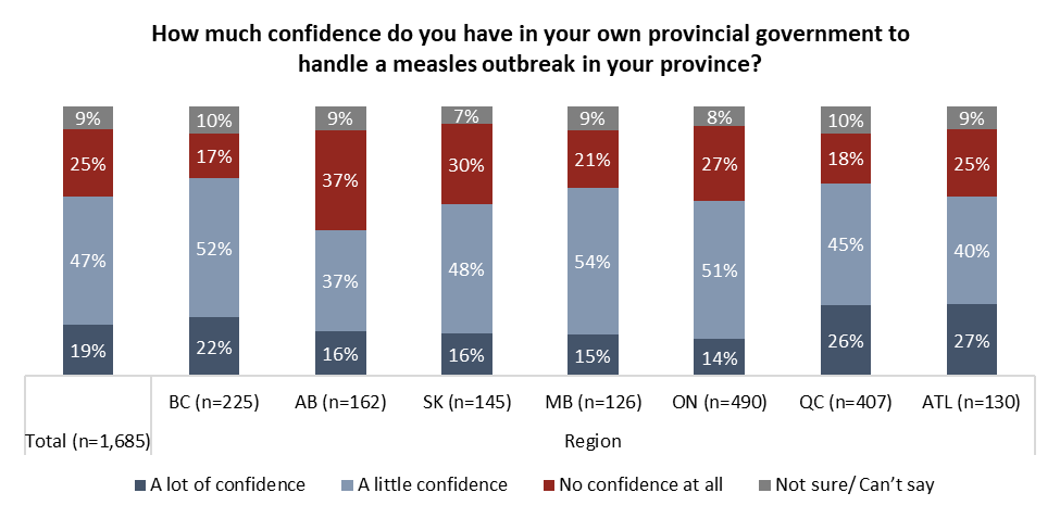 As to the practical and political aspects of responding to measles, many Canadians lack confidence in their provincial government to adequately respond. One-quarter (25%) say they have no confidence in their province, rising to 37 per cent in Alberta, 30 per cent in Saskatchewan, and 27 per cent in Ontario.