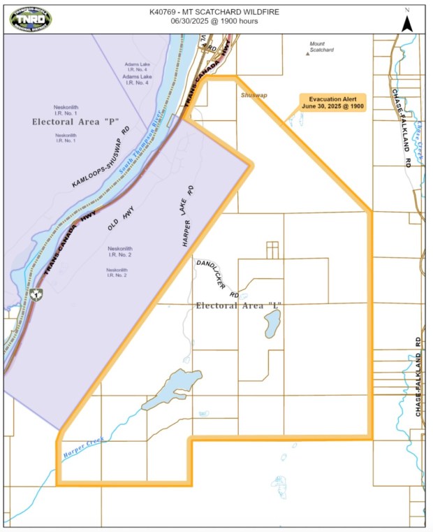 An evacuation alert has been issued by the Thompson-Nicola Regional District, effective June 30, 2025, due to the Mount Scatchard wildfire (K40769) about four km. southwest of Chase.