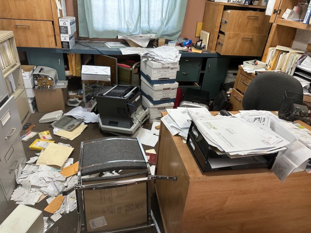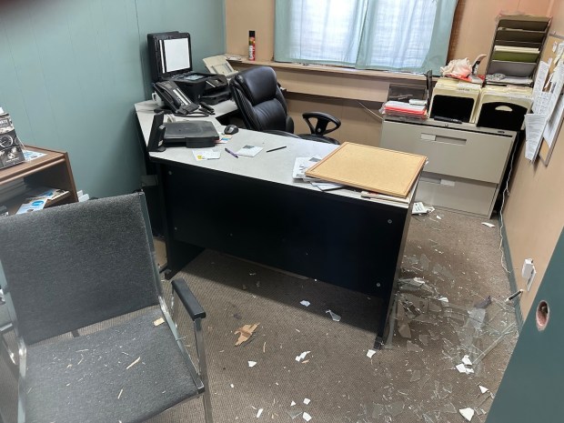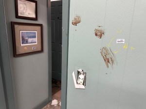 Nothing escaped their vengeance, if that’s what it was. Shattered glass litters the entire floor of the lobby, offices and store rooms. Computer screens, hard drives, audio visual equipment, a photo copier and a printer sit dented or in pieces. Doors have been ripped off cabinets. Cleaning supplies has been tipped over. A large one-way window that partitioned the reception area from the offices is in a thousand shards. Even the coffee maker has been smashed.