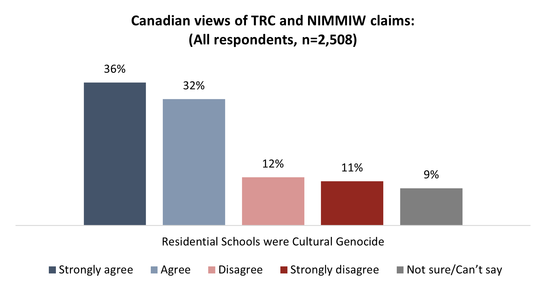 By a wide margin (63% to 24%) Canadians oppose the criminalization of public statements of denialism.  Indigenous respondents were split on this issue with 45 per cent opposing this, and 42 per cent saying that such denialism should be a criminal offense.