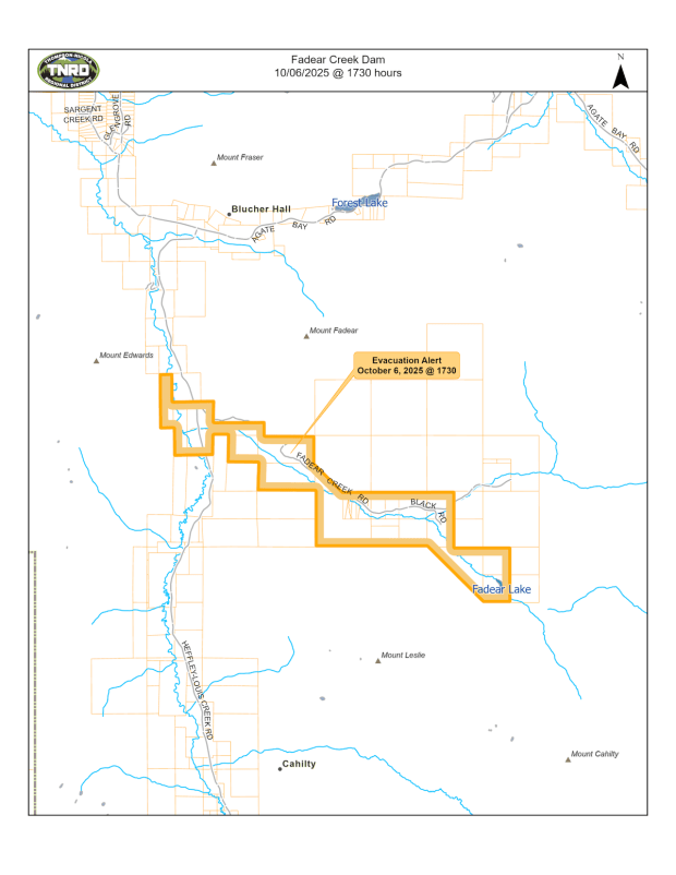 An evacuation alert has been issued by the Thompson-Nicola Regional District, effective Oct. 6, 2025 at 5:30 p.m., due to what it calls the potential imminent failure of the Fadear Lake dam.