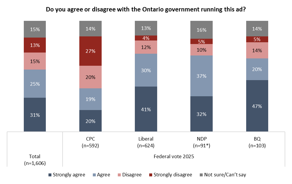 Views in Ontario align with the national average, with 57 per cent agreeing and 27 per cent disagreeing. Notably, Conservatives at the federal level are much more likely to disagree with the ad running (47%), which some say was an unnecessary agitation of a notoriously fickle negotiating counterpart.